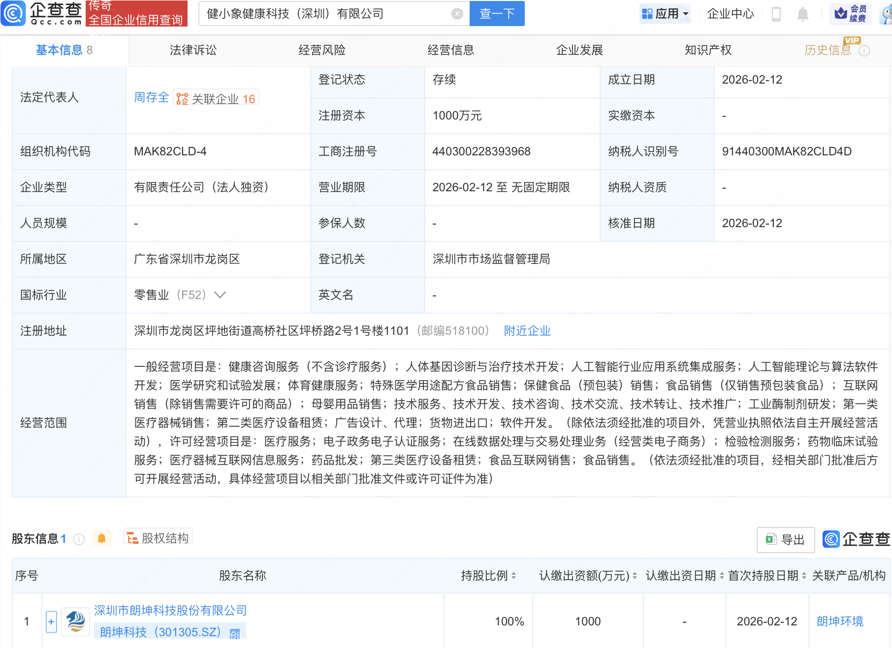 近日,健小象健康科技(深圳)有限公司成立,注册资本1000万元,经营范围包含:人体基因诊断与治疗技术开发;人工智能行业应用系统集成服务;人工智能理论与算法软件开发等。企查查股权穿透显示,该公司由朗坤科技(301305)全资持股。