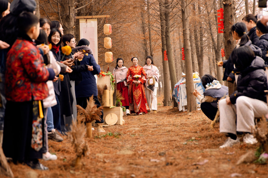 婚礼的每一处细节都藏着自然与环保的巧思:新娘的喜服是小姐妹结婚时穿过的;废弃的门板当“迎宾板”,生态农场的露天蔬菜、马路边捡拾的掉落松果,充当“气氛组”;橘子皮剪成花瓣压成装饰花,芦苇、高粱和水稻束插在竹筒里,作为步道迎宾花;木舞台是海豚亲手打造且重复使用的旧物,摊位架子是3年前从展览撤展拆解的 “老伙计”,毛毡喜字可回收;自制的喜糖喜饼装在可重复利用的不锈钢餐盒中……